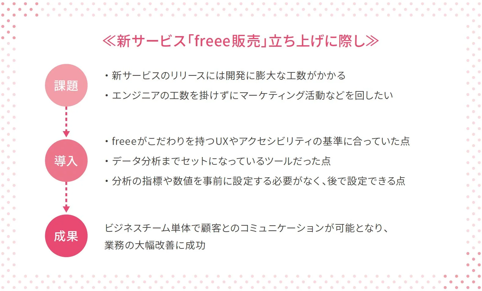 「新規事業の立ち上げ時には、スピード感を持ってPDCA(Plan・Do・Check・Action)サイクルを回す必要があります。また、前提として、新サービスのリリースからしばらくの間は、基本的な必須機能の開発に注力するため、マーケティングやカスタマーサクセスに必要な部分は開発工程の中で後回しになりがちです。そこで、エンジニアの工数をかけずにマーケティングやカスタマーサクセス活動を回せるようなツールが必要だと感じていました」と、freee販売の立ち上げを担当した、プロジェクト本部freee販売事業部チーム長の古部洸介氏は語る。