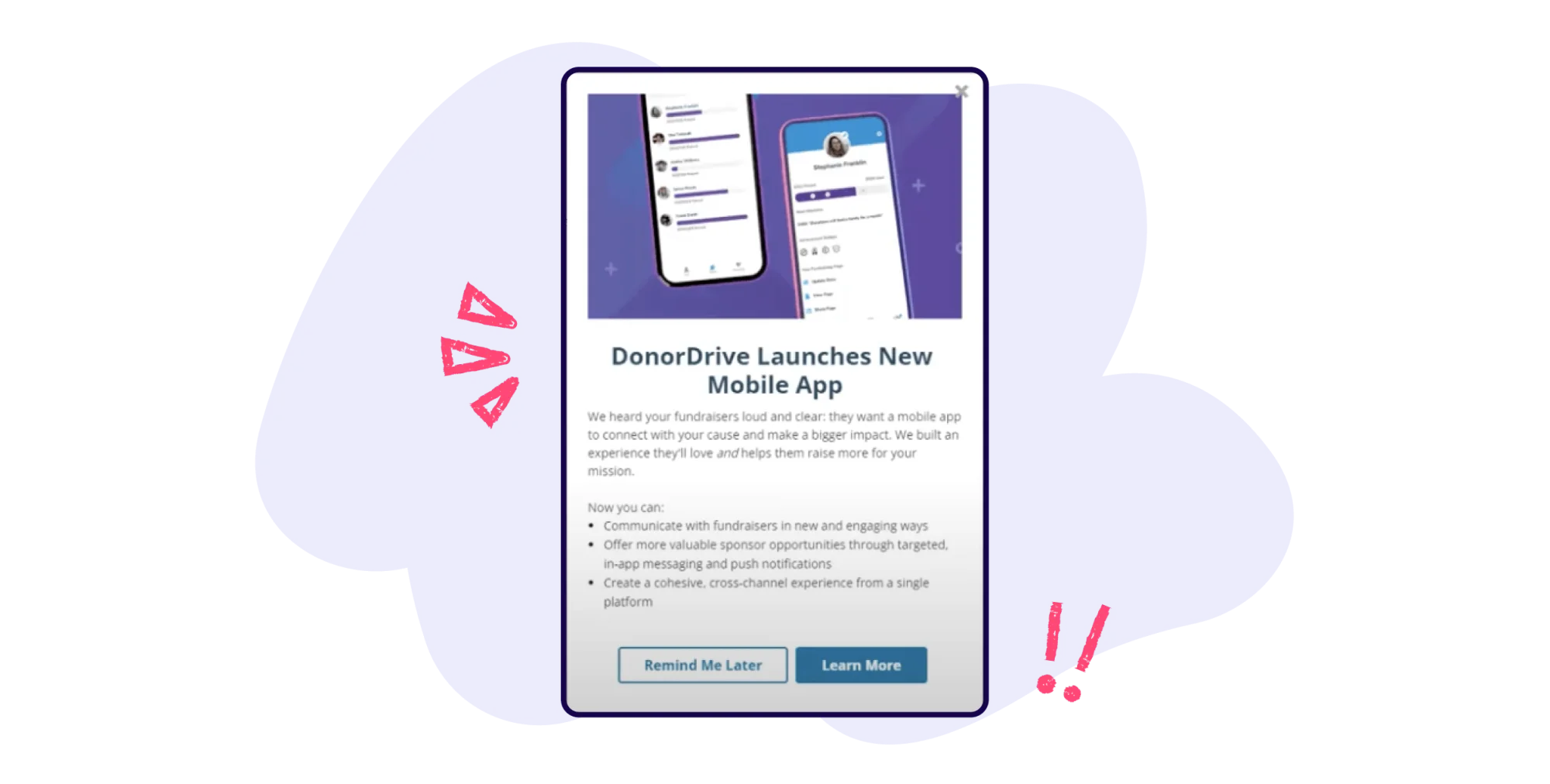 DonorDrive souhaitait accroître la visibilité sur l'adoption de ses nouvelles fonctionnalités. Cependant, leur méthode traditionnelle de le faire par e-mail a limité la sensibilisation et l'adoption qu'ils pouvaient générer. L'entreprise avait besoin d'un meilleur moyen de mettre en avant de nouvelles informations et de nouveaux développements pour les clients, afin qu'ils ne restent pas enfouis dans la boîte de réception d'un utilisateur.