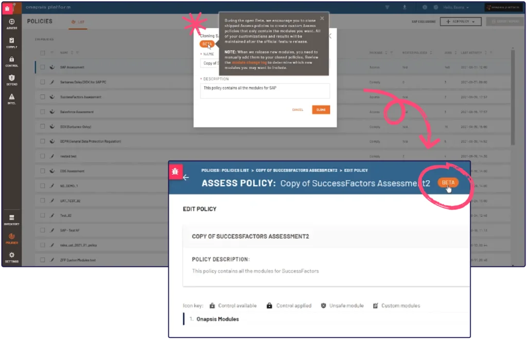 Within the product itself, the feature appeared as a new menu item. So Barbieri created a clearly visible badge to indicate that the feature was in beta. Whenever a user hovered over the badge, a tooltip would appear to explain what Onapsis’ beta program entailed, as well as a link to the additional details from the news announcement. “We’d never really done a beta like this before,” Barbieri explained. “So that was another challenge to explain what we were doing.”