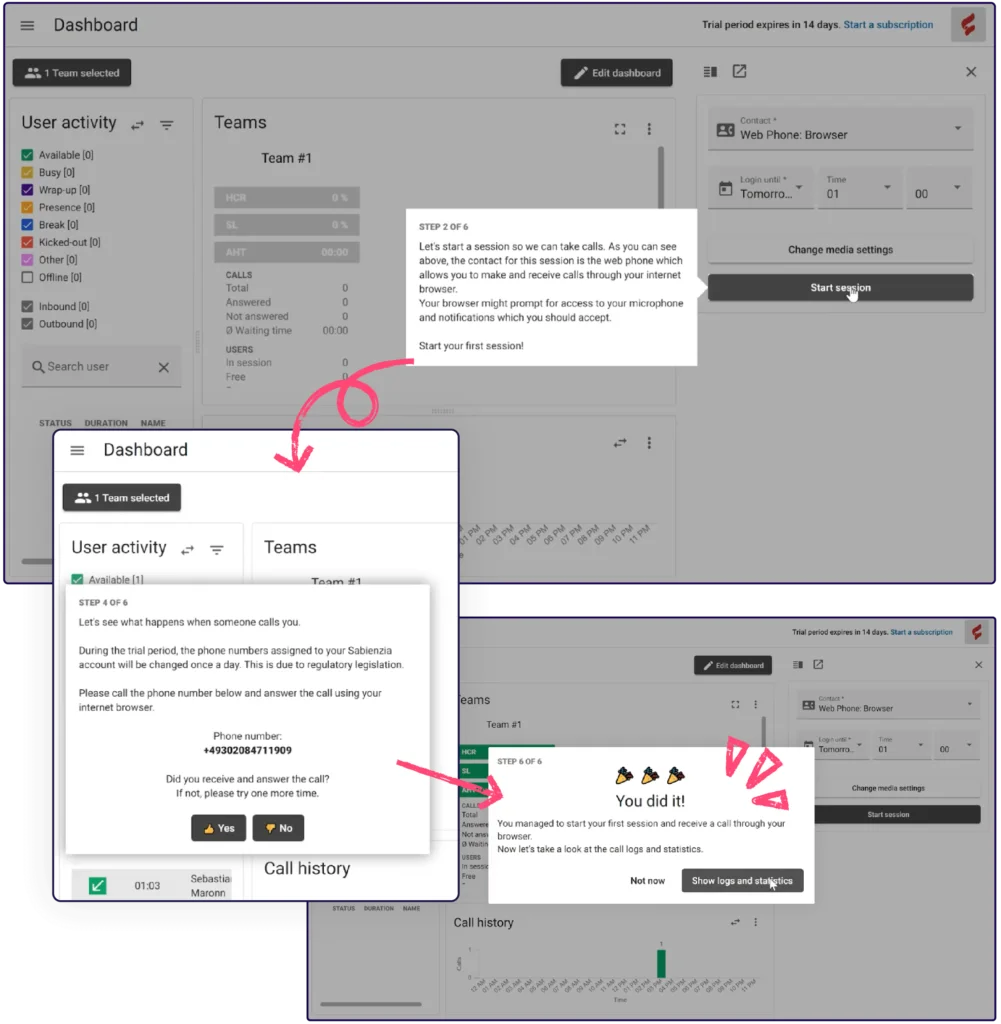 L'expérience d'onboarding de Sabienzia a commencé par un simple guide de « bienvenue », conçu pour guider les nouveaux utilisateurs à travers les actions et les domaines clés de la plateforme. L'équipe a également intégré un élément interactif à la visite, encourageant les utilisateurs à essayer de passer et de répondre à un appel téléphonique au sein de l'application. C'est là qu'un guide in-app Pendo personnalisé s'est avéré utile. « C'est là que nous avons placé le guide avec un bloc de texte contenant le numéro de téléphone », explique S. Maronn. « Nous avons également ajouté une mention indiquant que pendant la période d'essai, le numéro de téléphone serait modifié une fois par jour en raison de la réglementation en vigueur. »